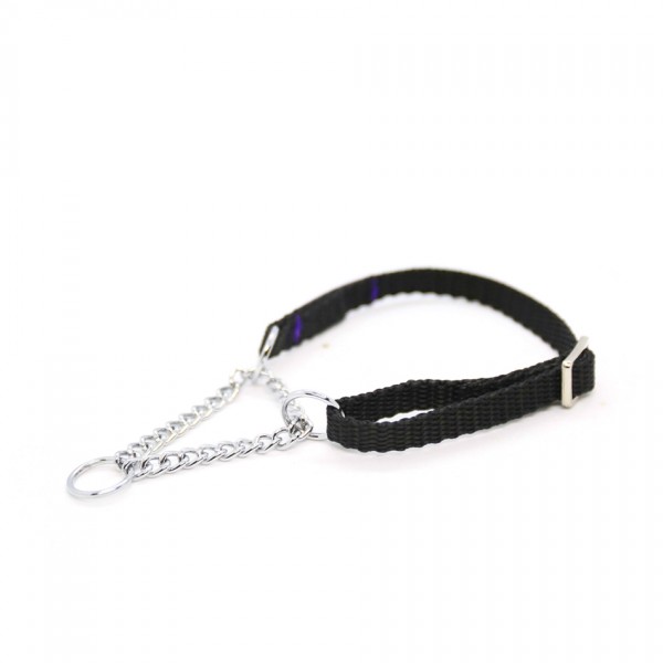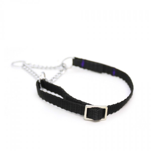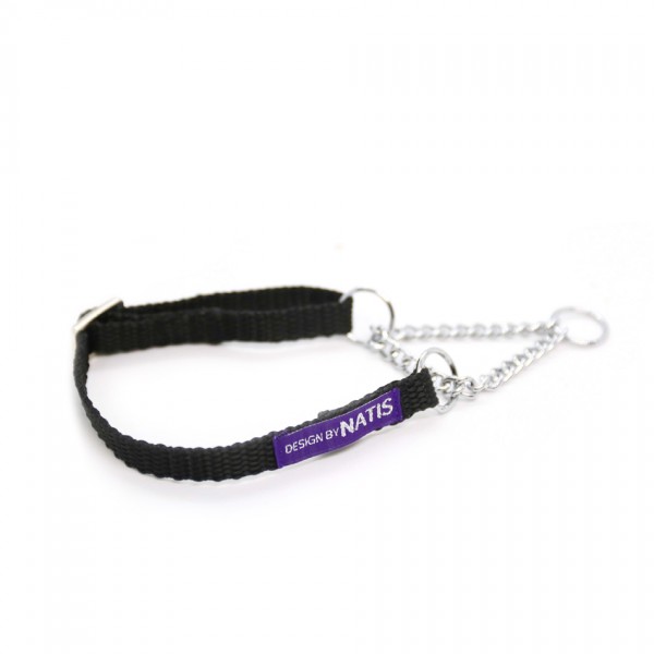 These simple collars do not have clips, but are simply placed over the dog's head. The metal part ensures that the collar can be stretched and tightened but only up to a certain length. The part of the collar that consists of the strap is adjustable and thus allows the collar to grow with the dog or adapts to different neck circumferences.