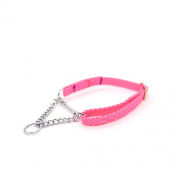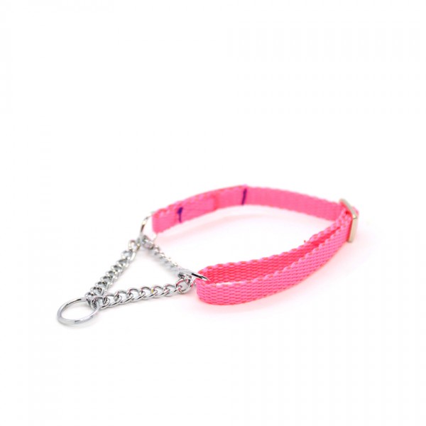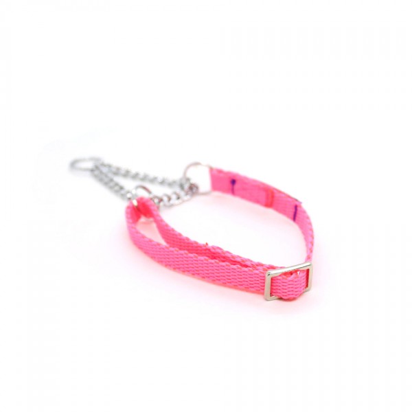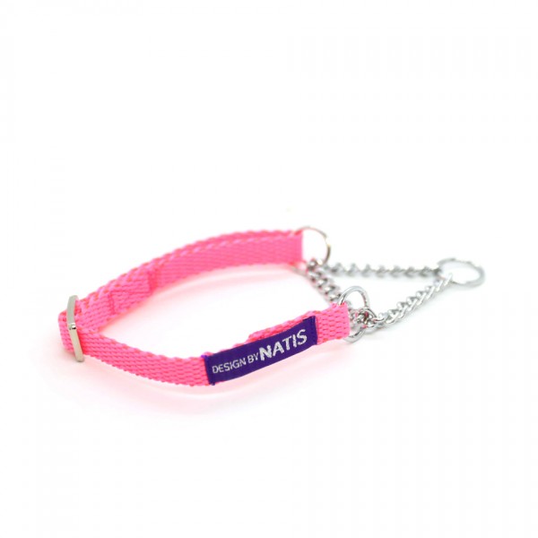These simple collars do not have clips, but are simply placed over the dog's head. The metal part ensures that the collar can be stretched and tightened but only up to a certain length. The part of the collar that consists of the strap is adjustable and thus allows the collar to grow with the dog or adapts to different neck circumferences.