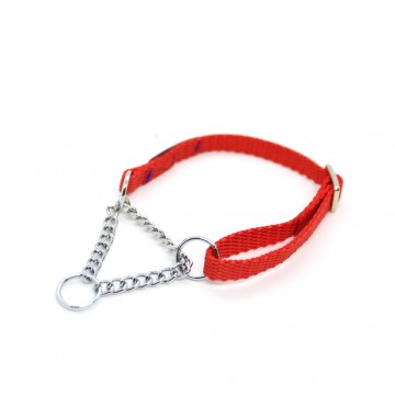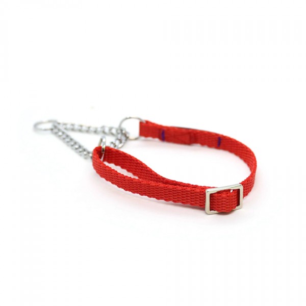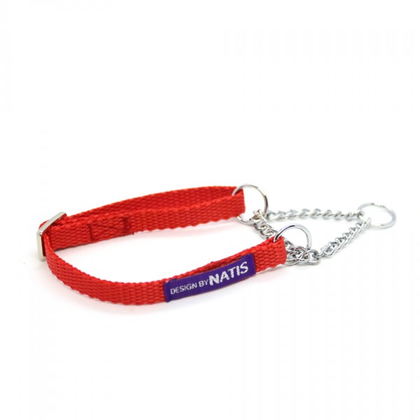 These simple collars do not have clips, but are simply placed over the dog's head. The metal part ensures that the collar can be stretched and tightened but only up to a certain length. The part of the collar that consists of the strap is adjustable and thus allows the collar to grow with the dog or adapts to different neck circumferences.