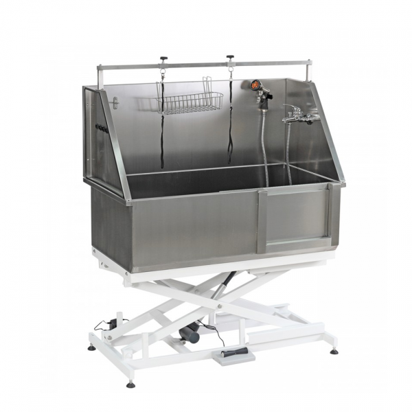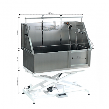 Universal bathtub for professional use. Made of stainless steel and mounted on a compact electric frame. The height is adjustable using pedals between 29 and 93 cm.