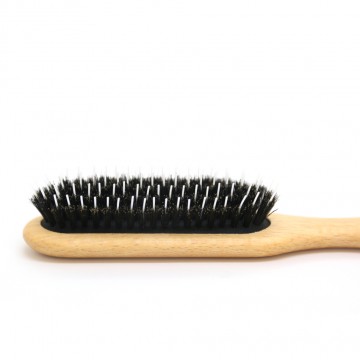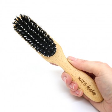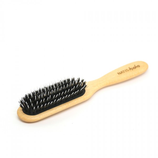 This brush is made in Europe exclusively for our own brand NATIS®. Its lightweight wooden body is ergonomically designed for comfortable use without tiring the hand. The plastic pins penetrate the coat to gently detangle and loosen any knots, while the boar bristles remove dust and dirt and polish the surface of the coat.