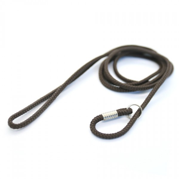 This cotton leash is made of 3mm round cord and has a handle on one side and a loop on the other for a continuous tension. This type of leash is suitable for experienced handlers and well-trained dogs, as its purpose is not to strangle the dog all the time it is performing in the show ring! It allows us to show the dog on a loose leash, but at the same time gain attention with a quick pull of the leash.