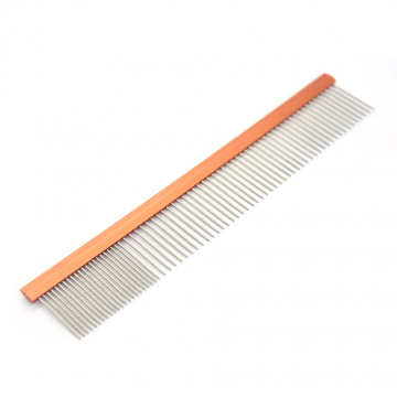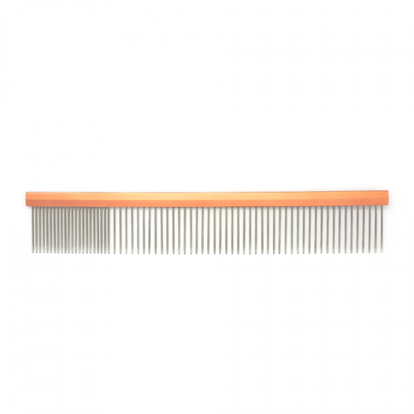 A long metal comb with two different densities of teeth is an essential tool for grooming fur and identifying foreign objects within it. Due to its Teflon coating, this comb will not create static in the fur.