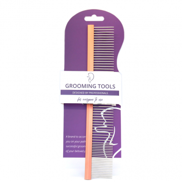 A shorter metal comb with double-length teeth that alternate along the entire length (short, long, short, long...). This type of tooth arrangement is ideal for tufting the coat at the show.