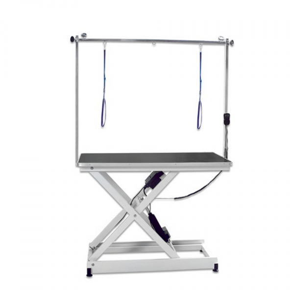 Electric grooming table with rectangular table top (60 x 110 cm). Height variation is 59 cm; low position 39 cm, high position 98 cm.