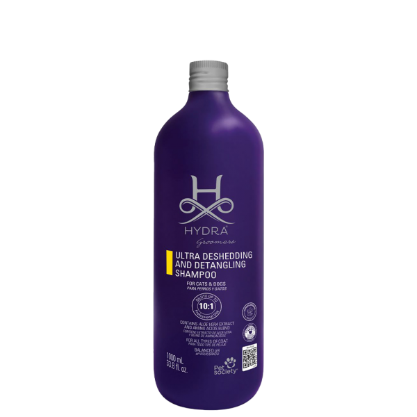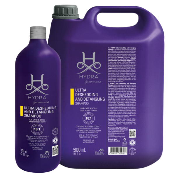 Hydra Groomers Ultra Deshedding & Detangling Shampoo is pH-balanced for pets’ skin, free from harsh chemicals or salts that could cause dryness, and safe for dogs and cats of all breeds from 4 weeks of age.