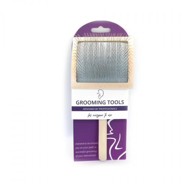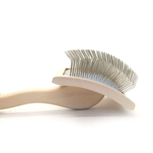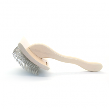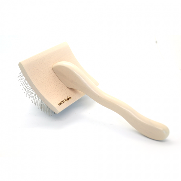 The curved slicker brush made of plastic is extremely light and comfortable for longer combing. Its medium length needles ensure that it is versatile, and the curved head increases the combing field and follows our movements.