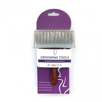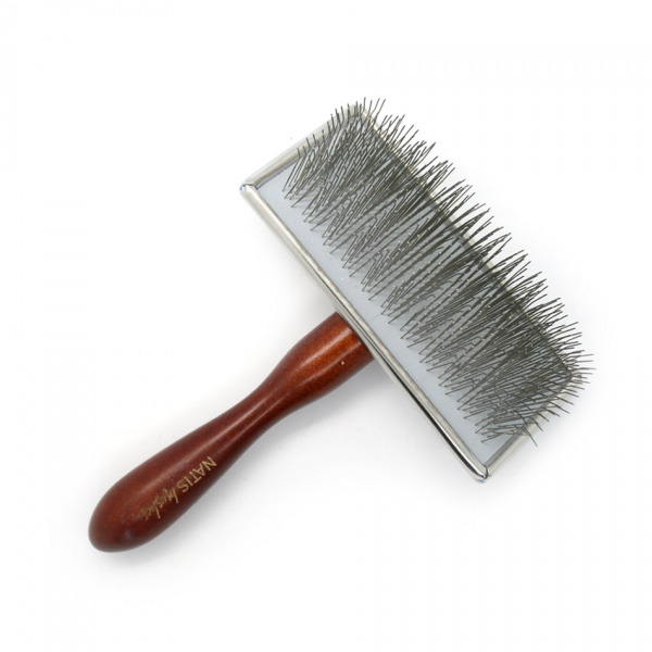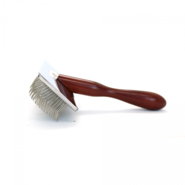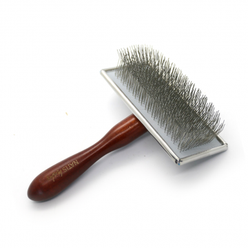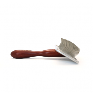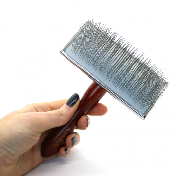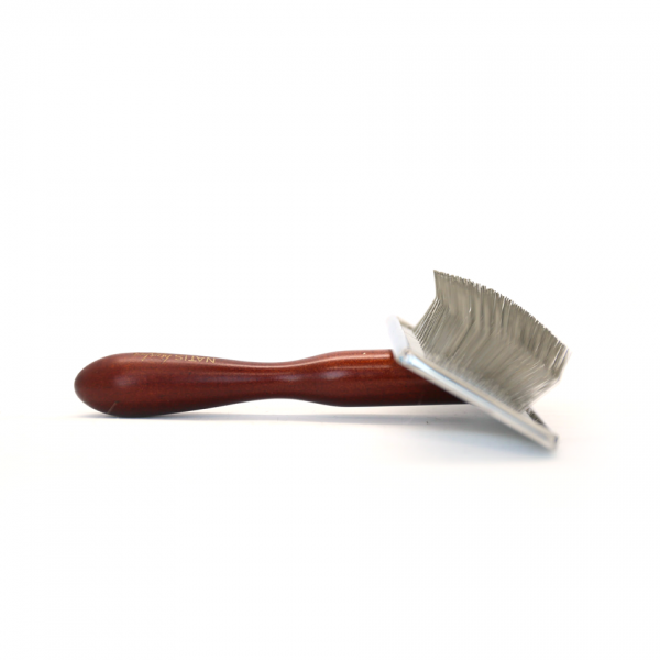 The sturdy needles of this classic slicker brush ensure efficient combing of even harder/fringed hair, while still being soft enough not to damage silky/soft hair. The sufficiently long and pear-shaped wooden handle is comfortable for combing. It is mounted in a metal rectangular head that has a firm pad with medium length needles.