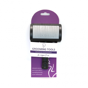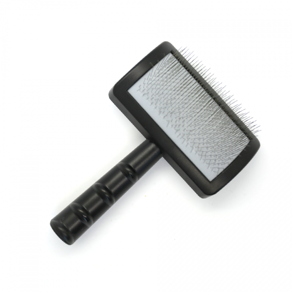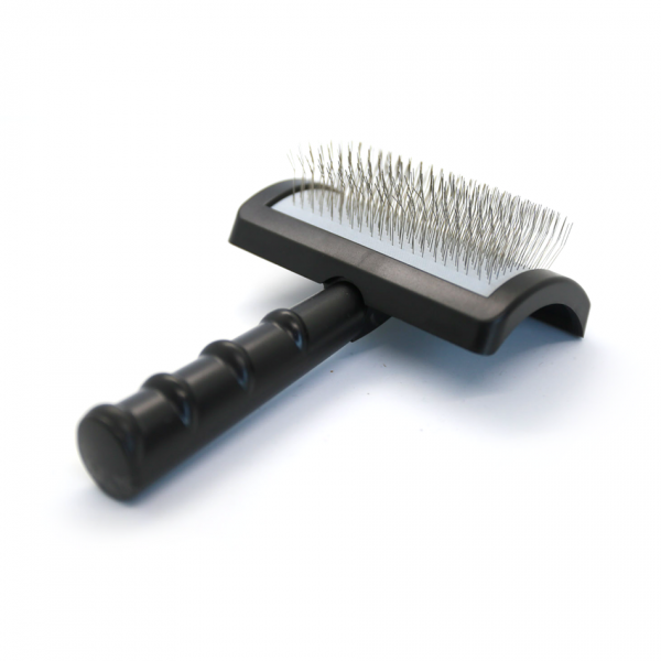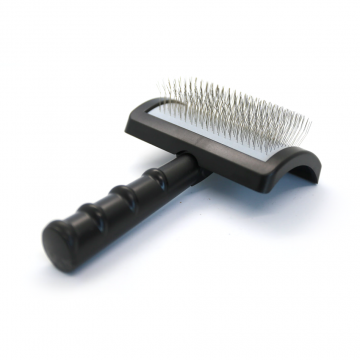 The solid needles of this slicker brush ensure efficient combing of even harder/fringed hair, while still being soft enough not to damage silky/soft hair. The long plastic handle is designed so that it does not slip while combing. The curved head increases the combing field and follows our strokes while combing.
