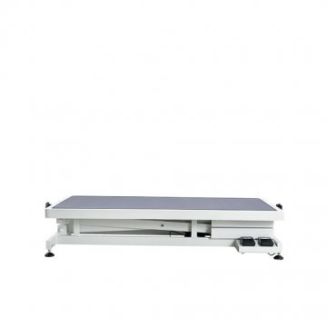 Električna miza za nego psov s pravokotno površino (65 x 125 cm). Višinsko razmerje med najvišjo in najnižjo točko je 74 cm; najnižja točka 21 cm, najvišja točka 95 cm.