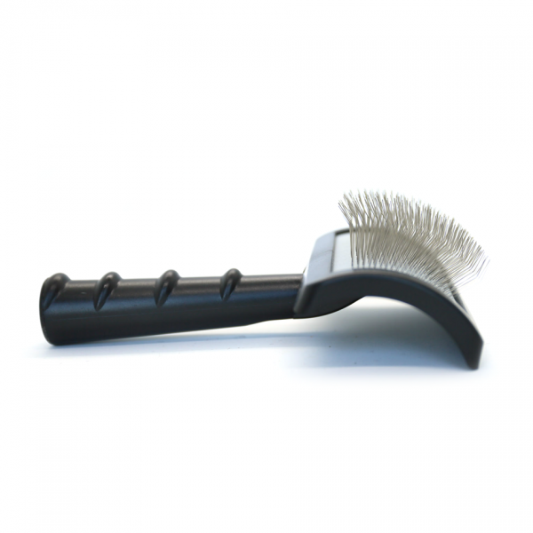 Zakrivljena slicker četka izrađena od plastike iznimno je lagana i udobna za duže češljanje. Njegove srednje duge iglice osiguravaju njegovu svestranost, a zakrivljena glava povećava polje češljanja i prati naše pokrete.