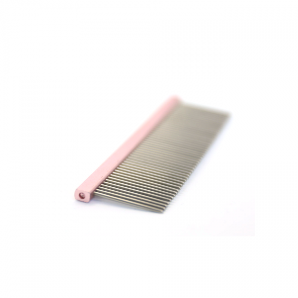 Dolg kovinski glavnik z dvema različnima gostotama zobcev, ki je bolj gosta od standardnih glavnikov, je odličen pomočnik pri česanju dlake med striženjem. Zaradi svoje elegantne oblike je izredno lahek a hkrati vzdržljiv.
