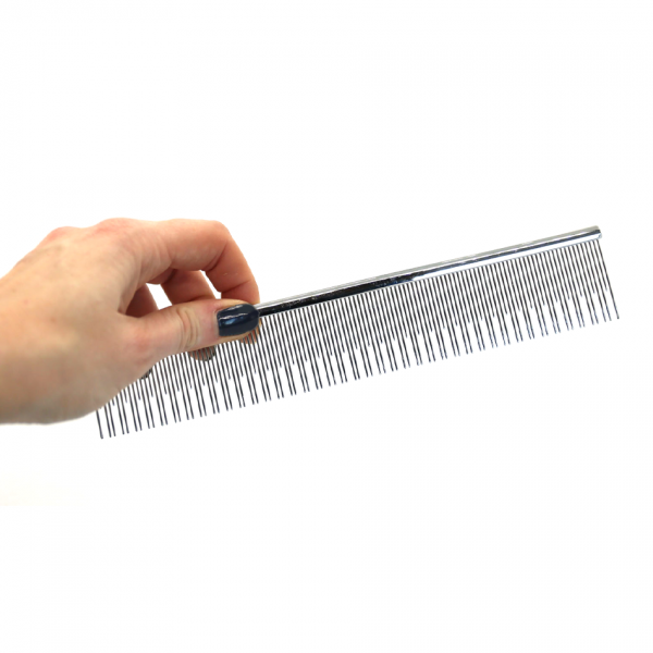 Srednji kovinski glavnik z dvema različnima gostotama zobcev, ki je bolj gosta od standardnih glavnikov, je odličen pomočnik pri česanju dlake med striženjem. Zaradi svoje elegantne oblike je izredno lahek a hkrati vzdržljiv.
